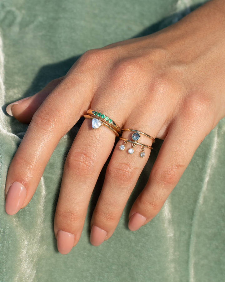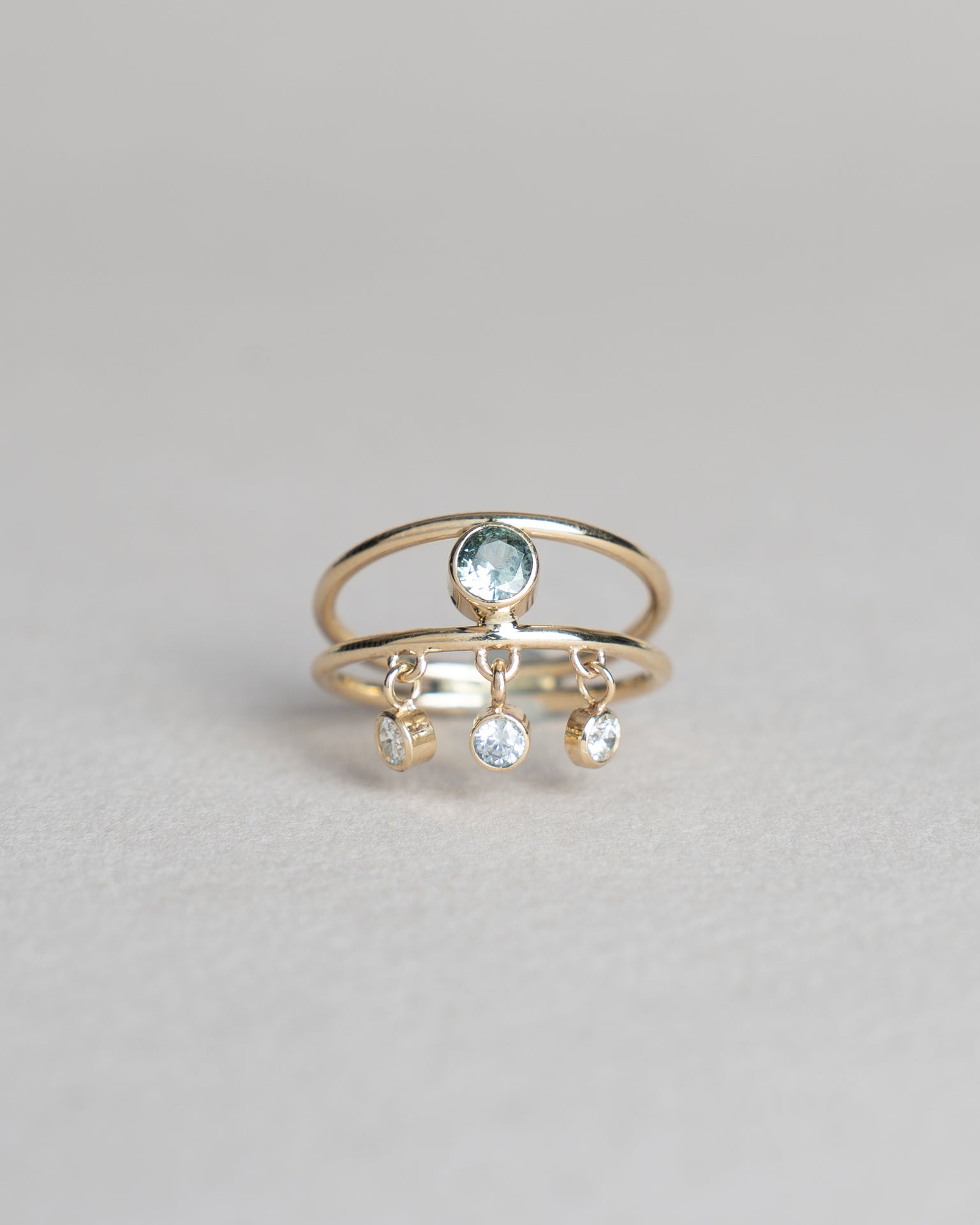 The Dew Drop Ring features a radiant green sapphire at its center, with three flowing diamond dangles that shimmer like dewdrops in the morning light, creating an ethereal and graceful movement.