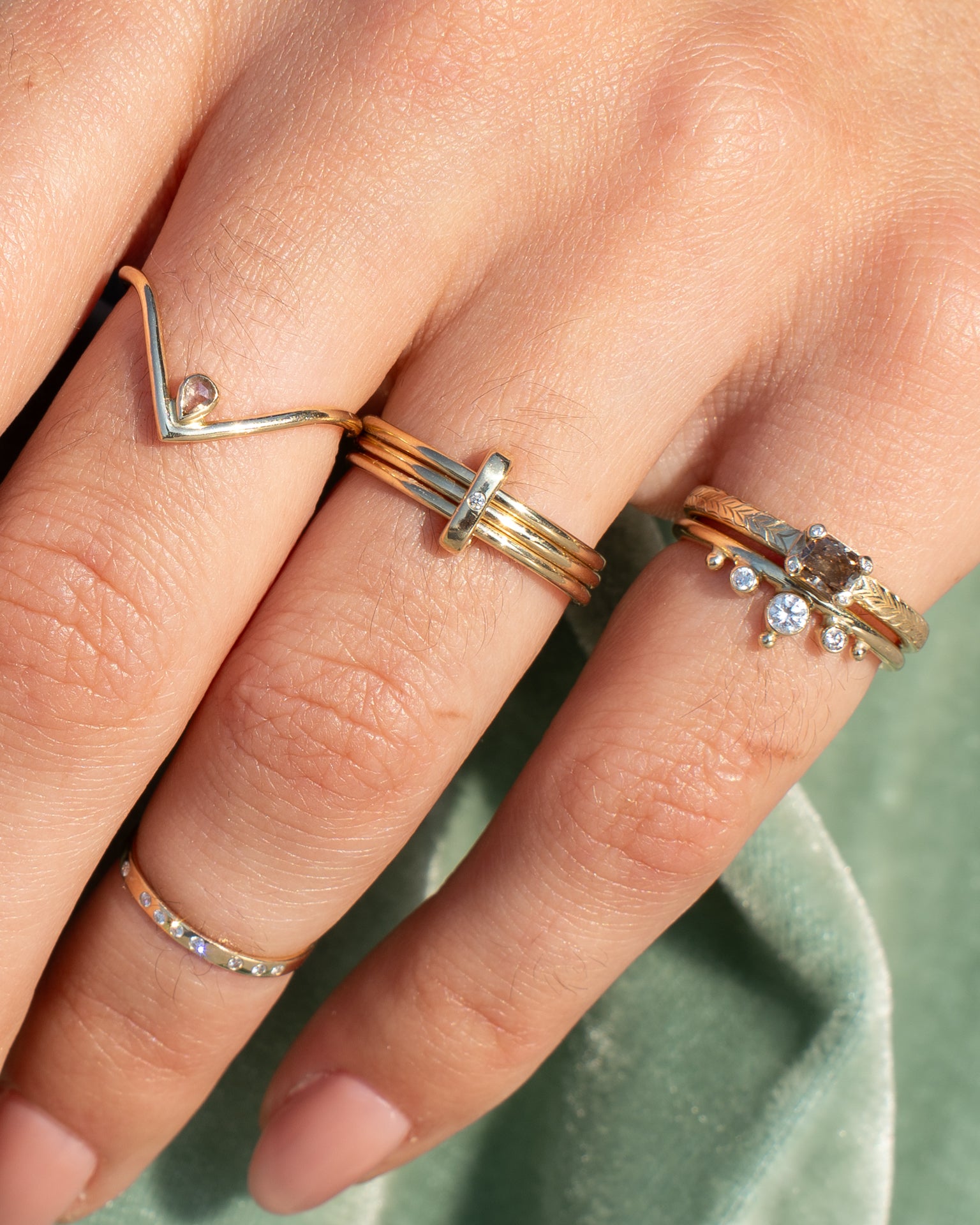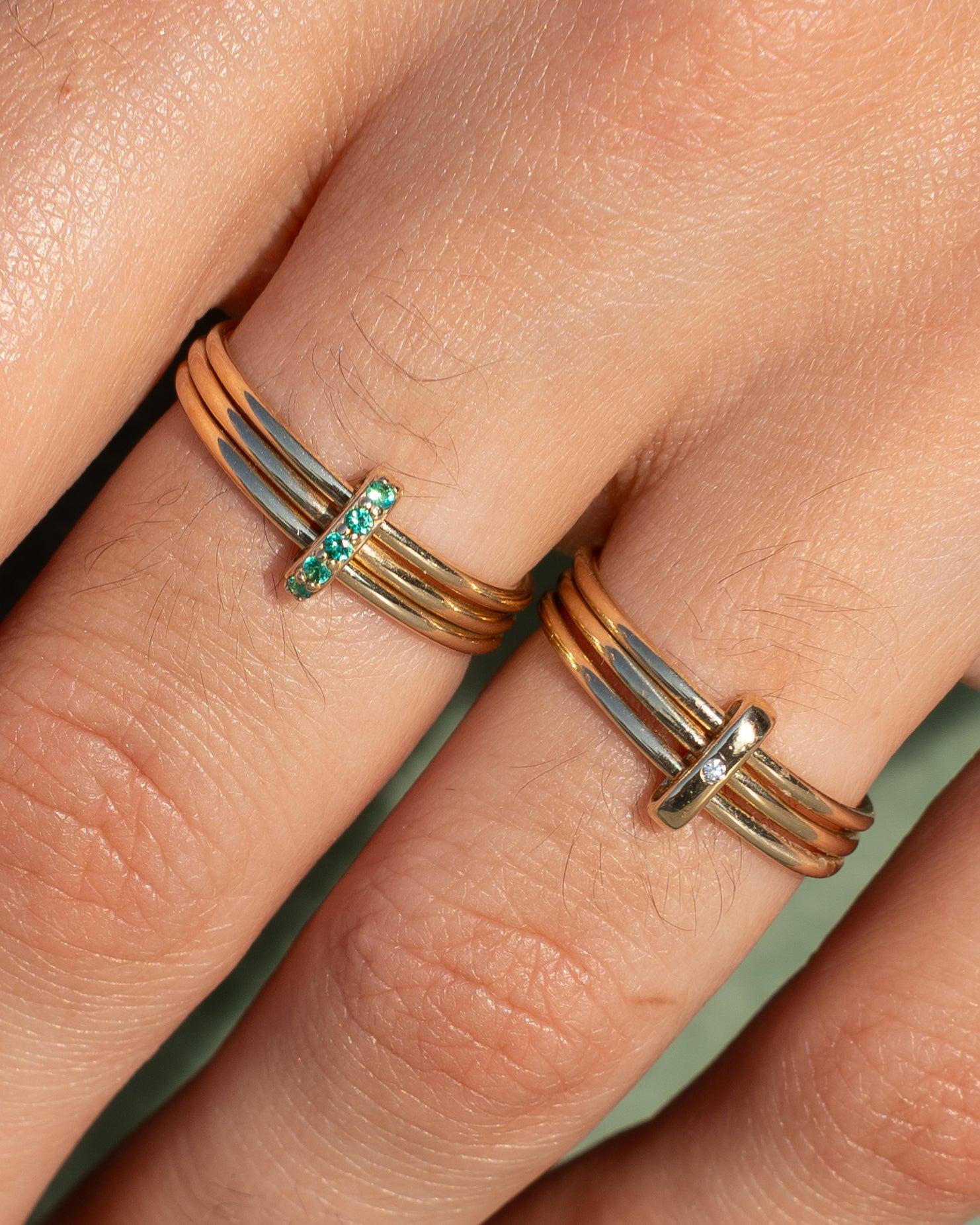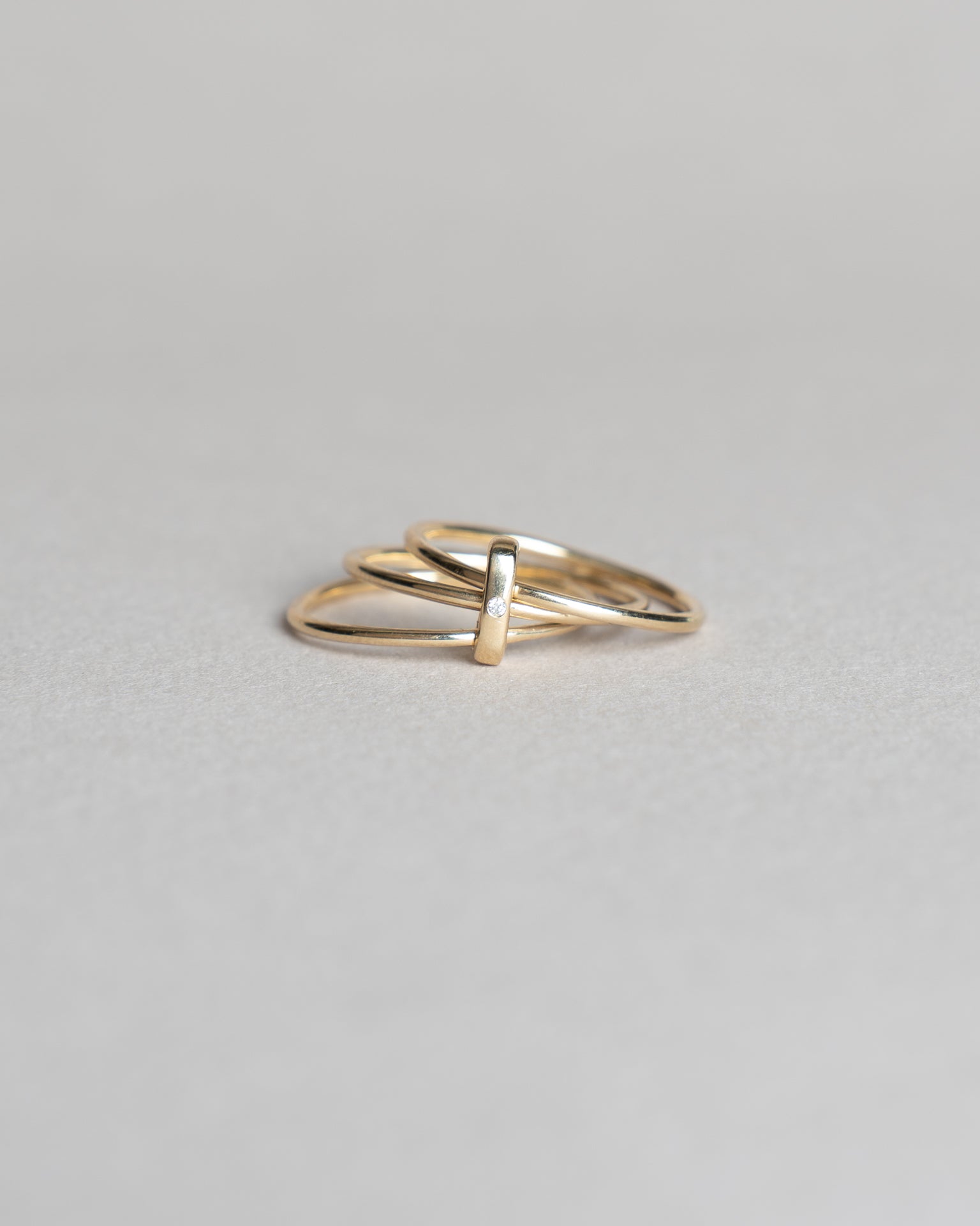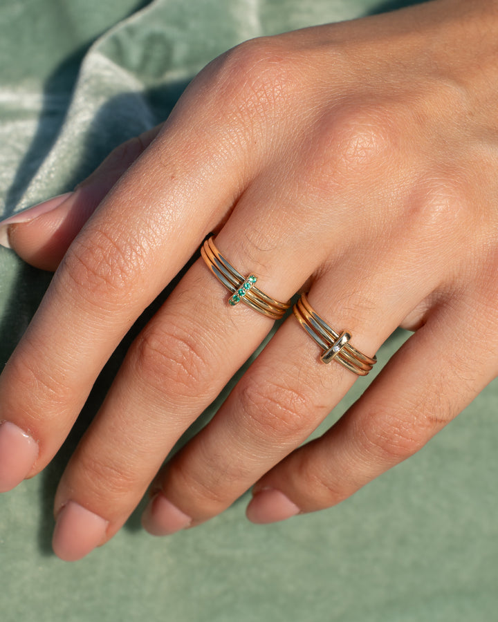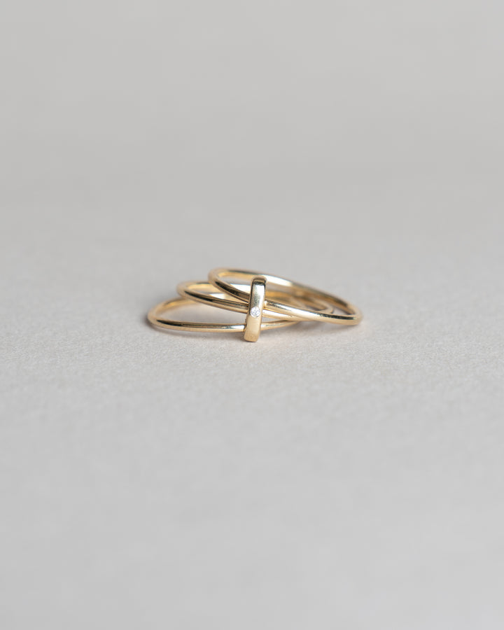 The Nexus Spark Ring features a modern design that celebrates the unique intersections of our lives. With three gold bands held together by a golden vertical bail and single diamond, it is an understated symbol of the intertwined journeys of love and partnership, and how they converge to form something beautiful. A timeless reminder of connection, unity, and the strength found in the bonds we share. Perfect for commemorating milestones and the meaningful relationships that shape our paths.