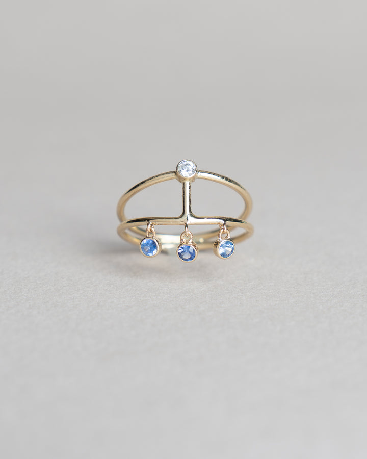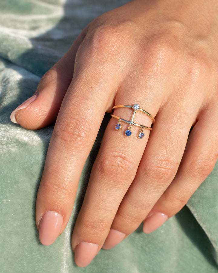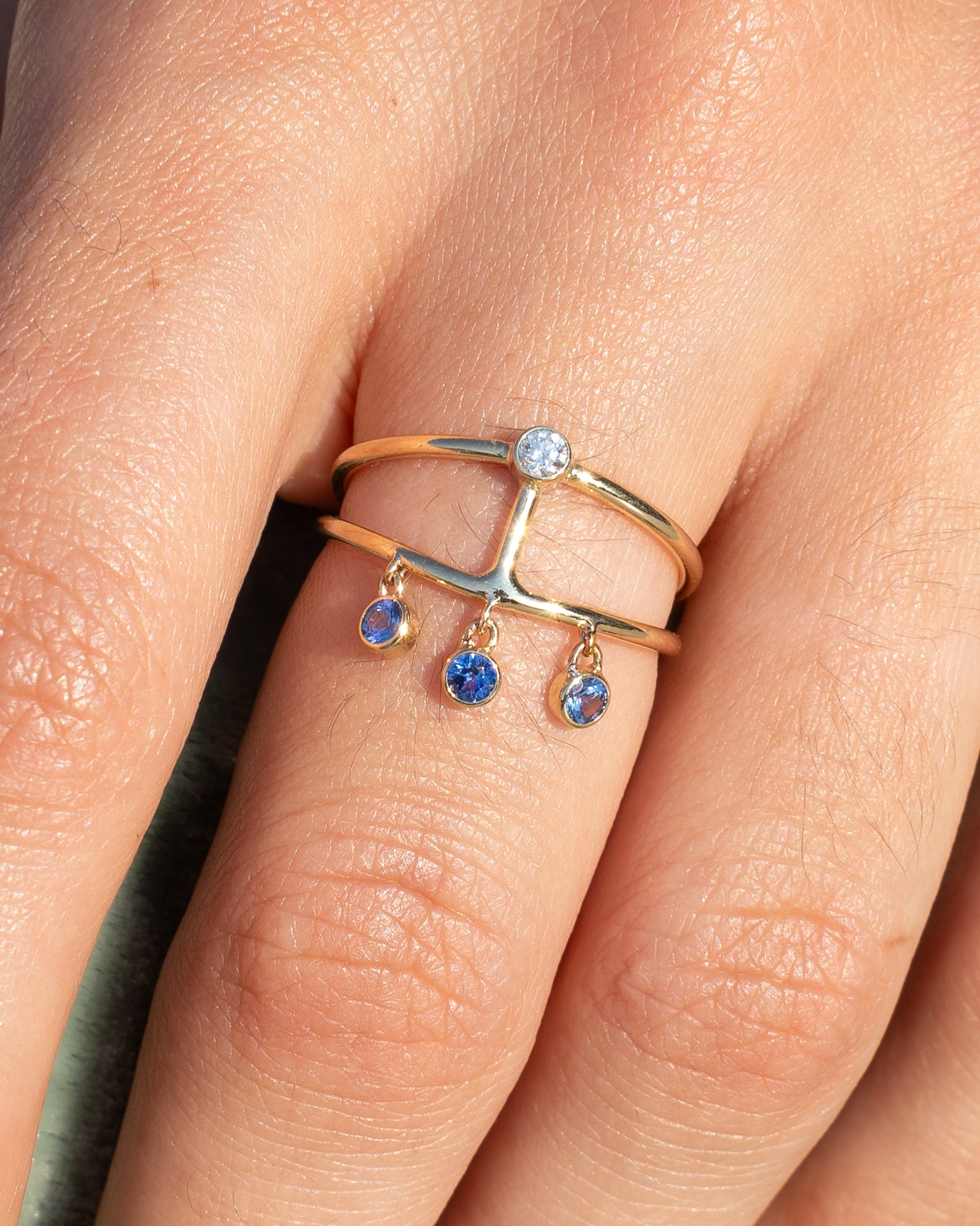 The Sapphire Dewdrop Ring features a radiant diamond at its bridge, with three flowing sapphire dangles that shimmer like dewdrops in the morning light, creating an ethereal and graceful movement.